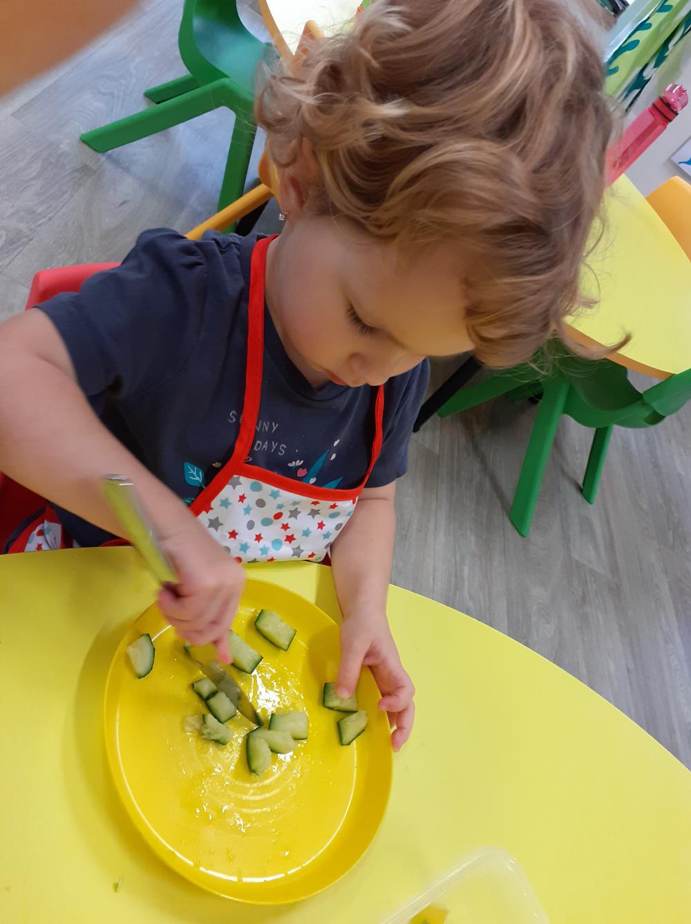 Tvoříme a hrajeme si, stavíme z nových kostek, v malém kuchtíkovi jsme vařili výýýýborný salát a navštívila nás fenka Mája, kterou jsme si mohli všichni pohladit a pomazlit.