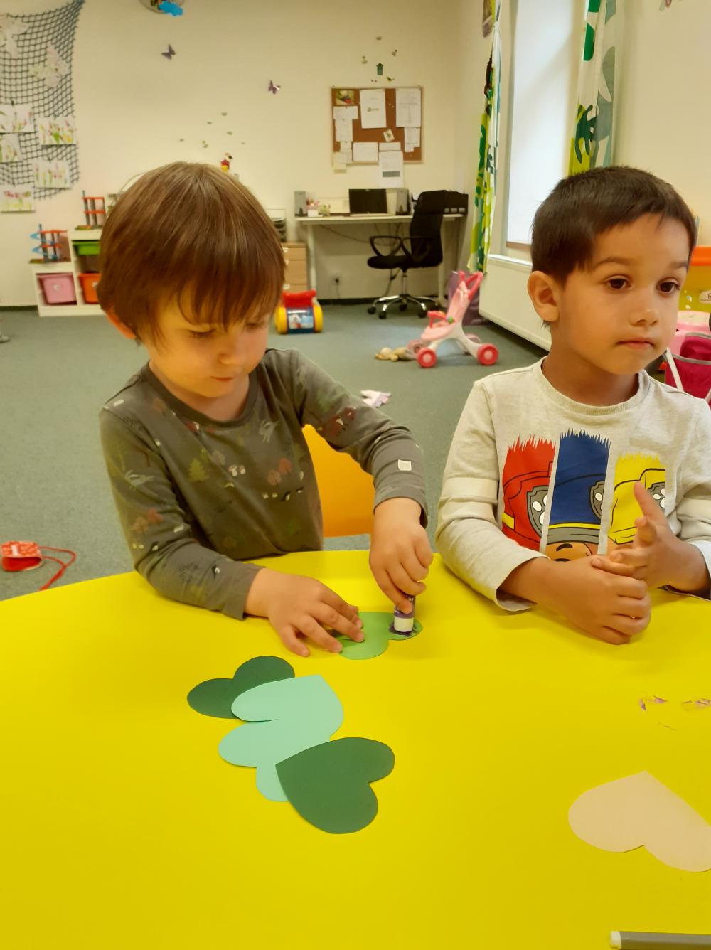 Tvořili jsme prsty barevné motýlky, mráčky s duhou a nově také nádherné zelené housenky, plné srdíček a lásky. Maminkám jsme k jejich svátku vyrobili narcisky v květináčku a moc se dětem povedly.